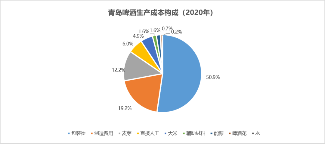 啤酒的生产成本主要由原材料(大麦、大米、啤酒花、淀粉等)、包装物(铝、玻璃、瓦楞纸等)、直接人工以及其他制造费用构成。