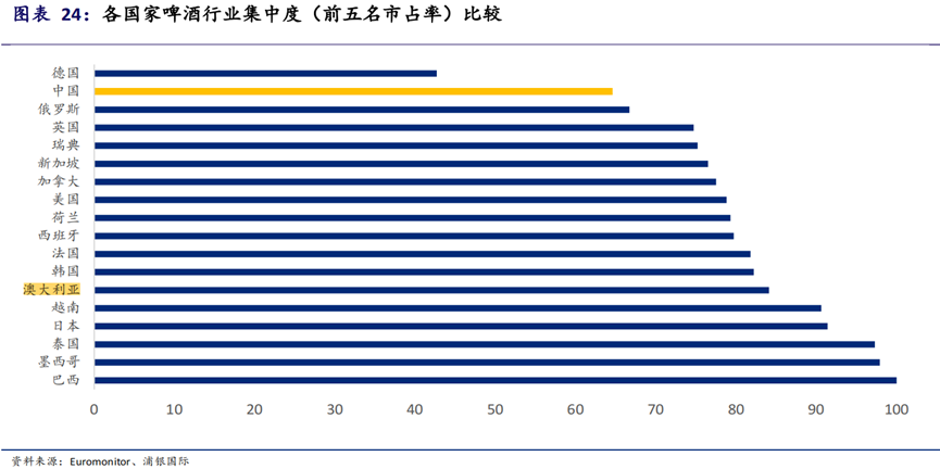 纵观国外成熟市场,啤酒行业都是高度集中的。据浦银国际研究显示,法国韩国澳大利亚日本等CR5都在80%以上,泰国、墨西哥巴西甚至超过了95%,已和巨头联合垄断无异。