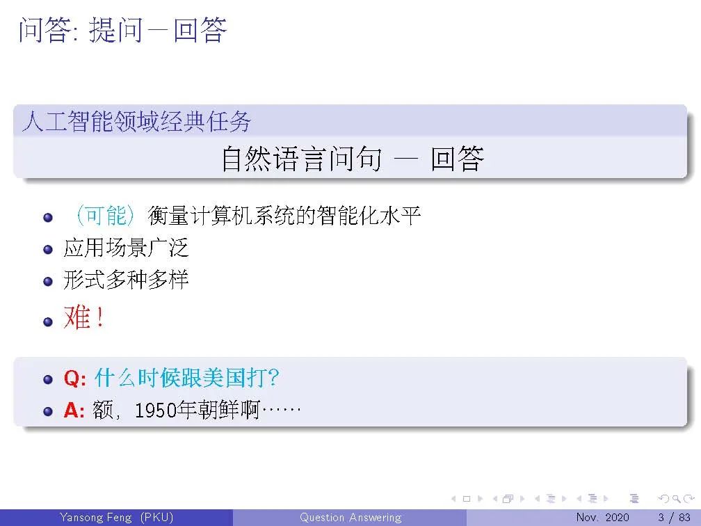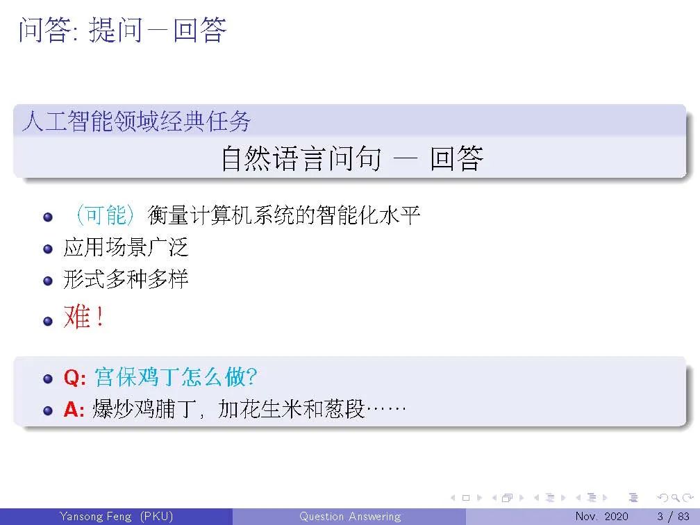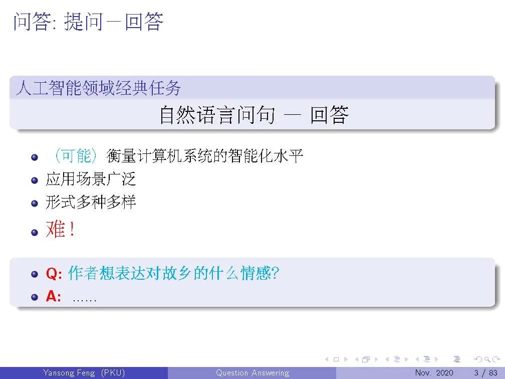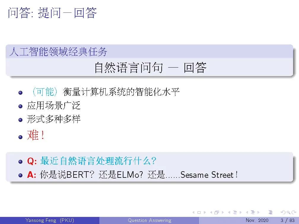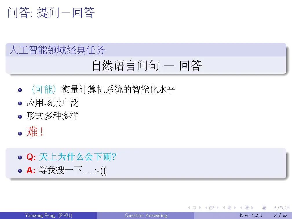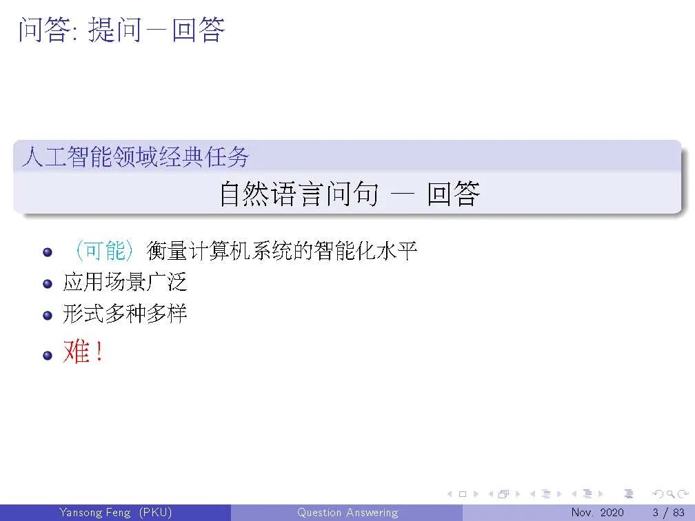 自然语言问答是支撑智能人机交互应用的核心技术,受到学术界和工业界的广泛关注。其中,基于大规模结构化和非结构化知识资源的智能问答更是近些年来的研究热点。本报告将首先梳理自然语言问答的发展脉络和基本概念;进而从基础技术框架、知识资源类型以及复杂问题解析等几个方面介绍近年来知识问答方向的研究进展;最后,将结合目前研究工作中仍存在的挑战与大家分享对未来研究的一些看法。