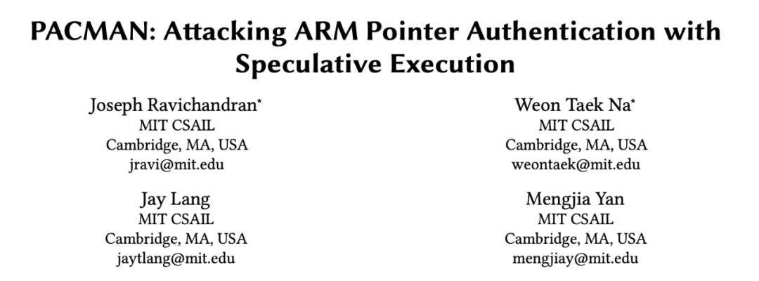 该研究团队由 MIT 电气工程与计算机科学系助理教授 Mengjia Yan 领导,成员包括 Joseph Ravichandran、Weon Taek Na、Jay Lang。他们将在本月即将举行的计算机体系结构顶会 ISCA 2022 会议上重点介绍「PACMAN」。