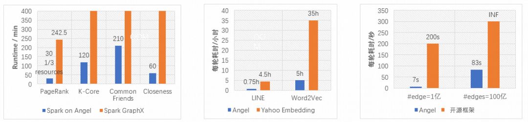 在3.0版本中,Angel重点研发了图机器学习功能,包括图表示和图神经网络学习模型,同时提供预处理、图挖掘等端到端数据处理能力,具有丰富的算法库,提供了同构图、异构图多种图计算范式和不同种类的图算法。经过腾讯内部业务的大规模实践,Angel在图算法性能上同样表现出众,例如十亿节点、千亿边规模的图结构,运行算法时能以Spark GraphX三分之一的计算资源,达到十倍处理性能。