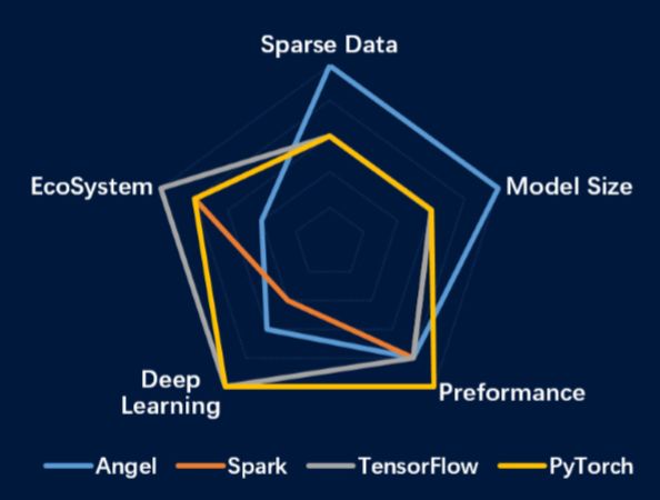 Angel擅长推荐模型和图网络模型相关领域(如社交网络分析)。图1是Angel和几个业界主流平台在稀疏数据,模型维度,性能表现,深度模型和生态建设几个维度的对比。Tensorflow和PyTouch在深度学习领域和生态建设方面优势明显,但在稀疏数据和高维模型方面的处理能力相对不足,而Angel正好与它们形成互补,3.0版本推出的PyTorch On Angel尝试将PyTorch和Angel的优势结合在一起。