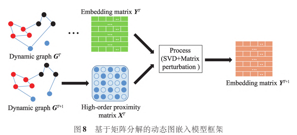 基于矩阵分解的动态图方法利用特征分解构造图的高阶相似度矩阵,然后利用矩阵摄动理论更新图的动态信息。DANE采用分布式框架:离线部分,采用最大化相关性的方法捕捉图结构和节点属性的依赖关系;在线部分,使用矩阵摄动理论更新嵌入的特征值和特征向量。