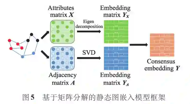 基于矩阵分解的图嵌入通过分解节点关系矩阵获得低维嵌入。不同的关系矩阵采用的分解方法不同 ,例如邻接矩阵通常使用奇异值分解(SVD)的方法生成节点嵌入,而属性矩阵通常使用特征值分解的方法。