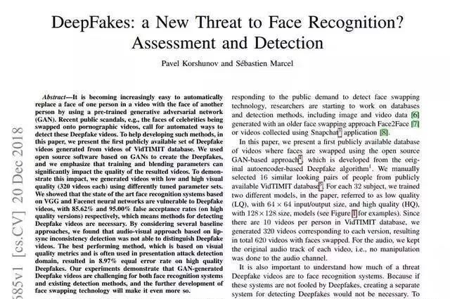 瑞士Idiap研究所两位科学家对「人脸识别方法检测DeepFake」进行了较为全面的测评 ,并发表了论文。