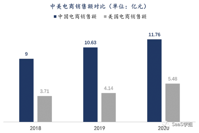 虽然美国互联网起步更早,但得益于中国人口和购买力的双引擎,电商行业的销售额一直远超美国,成为移动互联网时代最耀眼的那颗星。