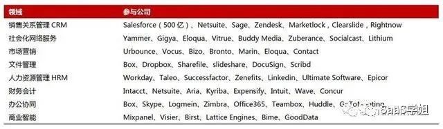其中,Salesforce 市值超过1440亿美元,Workday 的市值超过380亿美元。同时,在未上市公司中,也不乏估值超过10 亿美元的SaaS 独角兽公司,包括人力资源领域的Zenefits,商业智能领域的Domo 等。以及众多被收购的公司,包括人力资源领域的Successfactor、Taleo,差旅管理领域的Concur 等。
