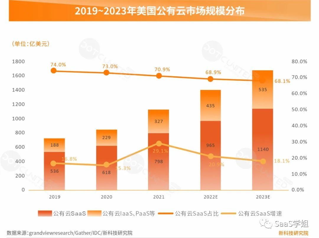 在美国,公有云SaaS占比,近几年的平均值是70%。