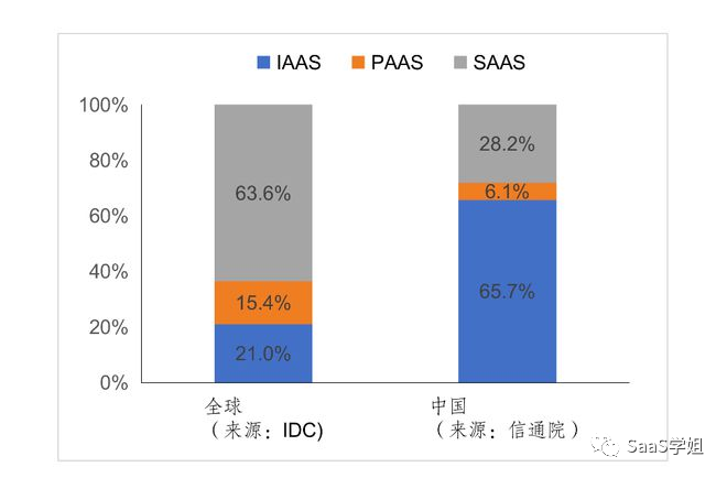 而这一数据在全球也有60%+的数据,但反观中国,SaaS占比不到30%。
