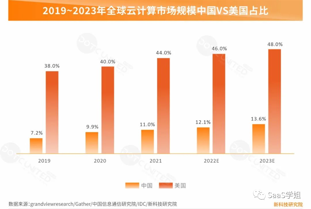 中国云计算在全球的市场份额在 2021 年突破两位数,达到 11%,预计到 2022 年占比约 12.1%,2023 年或达到 13.6%。