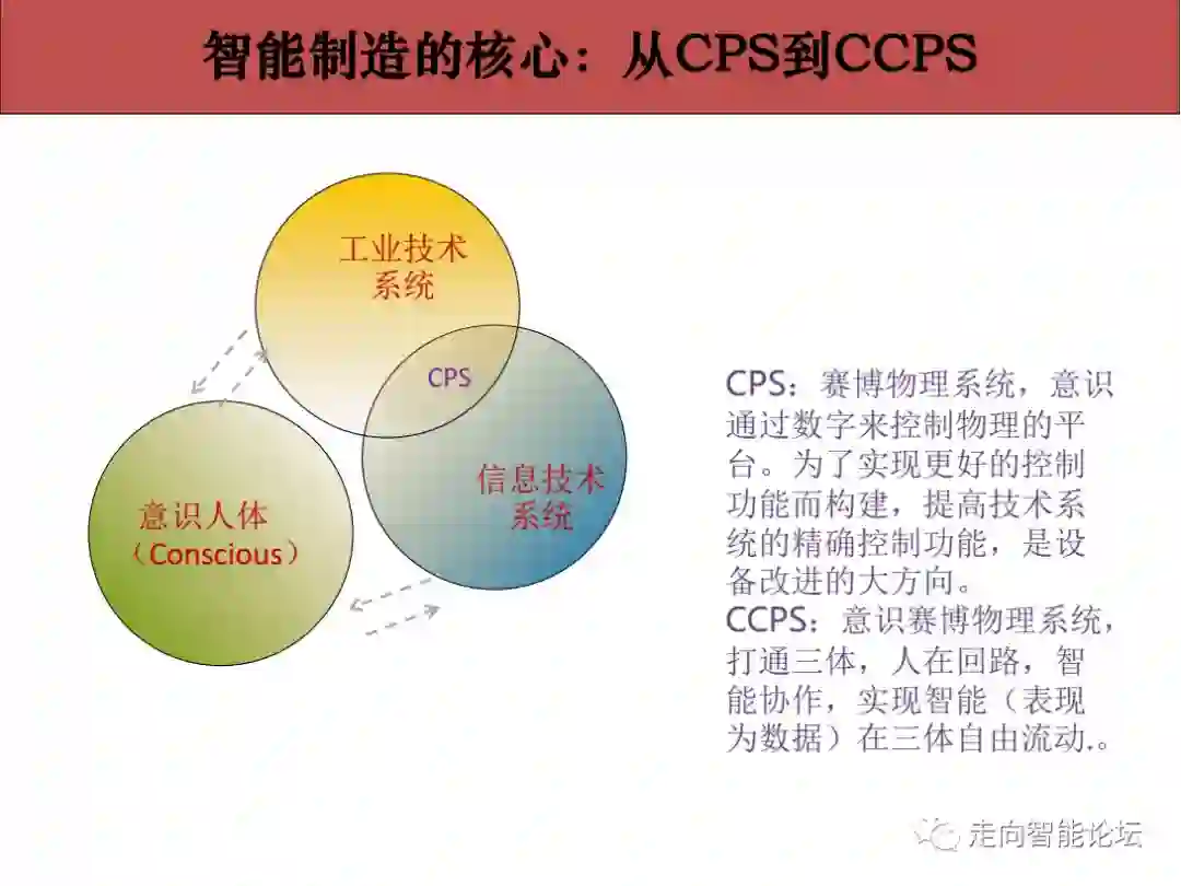 三体智能理论的核心,就是制造业的智能技术,核心是推动从CPS到CCPS的发展。CPS我们认为应该是叫赛博物理系统,就是人通过数字系统来控制工业技术系统的平台,它为了实现更好、更精确的控制功能而构建,是工业智能技术的核心,也是制造业“智能+”的发动机。但是为什么CPS出现了数十年一直不温不火呢,我的看法是在等待一个机会,等待5G。4G就是为了意识人体的高效互联而发明的,5G的大流量、低时延、广覆盖、可“切片”等特性,就是为了三体更高效互联、协作而发明的。我对5G时代的技术演进的预测是,5G+VR+MR等新技术将催生无处不在的意识赛博物理系统也就是CCPS,它将推动三体化一的技术发展,包括芯片嵌入人体、脑波直接读取、三体同在回路等,实现意数物一体化,知算行合一,到那时,我们才能说智能革命真正爆发了。而目前,只是进入智能革命爆发的前夜,人工智能即将面临突破,但现阶段具有经济价值的智能技术,主要还是L1与L2级的智能技术。