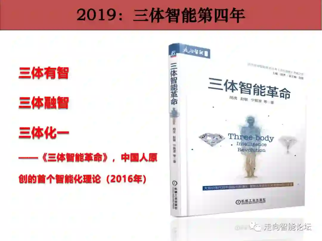 2016年10月份,《三体智能革命》由机械工业出版社出版。书中对智能从基本定义开始研究,出发点就是对人工智能的再认识。当时我们觉得社会上讨论的很多智能,比如说智能手机、智能制造,智慧地球,智能空调,根本就不是学科或者学术意义人工智能。但AlphaGo被超热以后,全社会一提起智能就将其与AI化等号,甚至和算法划等号。当时我们有句话,当工业界还在讨论Smart的情况下,全世界却在猛炒intelligence,很多人觉得是人工智能技术引导了智能制造等智能化技术革命的潮流,认为这个代表了未来,但对于一批来自工业界的专家学者而言,真实情况并非如此。