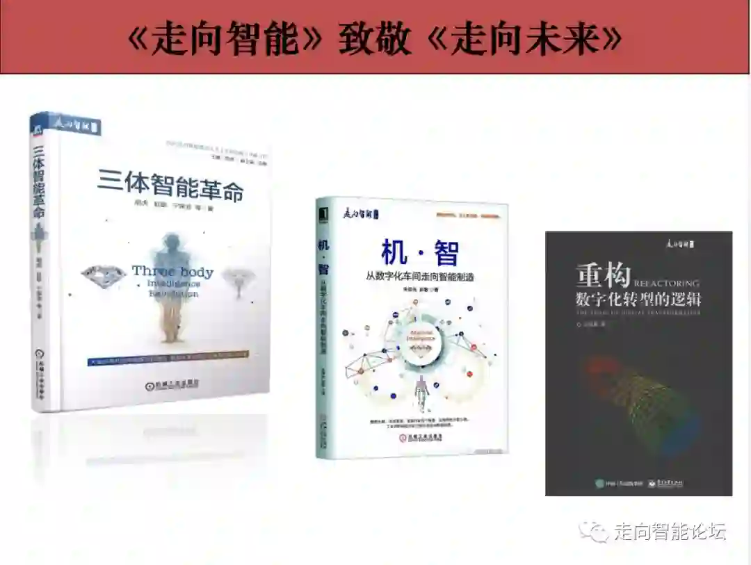 胡虎:受北京大学经济学院苏剑教授的邀请,很荣幸和大家做一个有关智能经济和智能理论的展望分享。谈到智能的话题,作为《走向智能》丛书的倡议者和最早发起人,早在2015年,我就和十几个行业的专家学者一起,酝酿通过跨界合作的方式去探索智能的基本原理,并向上世纪80年代知识界非常著名的一套丛书,以传播科技、新知为主题的《走向未来》丛书致敬。《走向智能》丛书到现在已经出了3本,第一本叫《三体智能革命》,2016年10月出版,探讨智能化的基本理论,我是这本书的主编,作者共有9位。第二本叫《机*智》,探讨工业设备,工业机器智能的演进规律,作者是知名工业互联网专家赵敏、朱铎先,第三本叫《重构:数字化转型的逻辑》,作者是中国信息化百人会的执委,安筱鹏博士,我国数字经济很多政策制定的参与者。这是国内第一套旗帜鲜明研究智能化浪潮的丛书。所谓《走向智能》,就是智能化,就是“智能+”,就是研究智能产业、智能经济,乃至智能社会,主要看读者希望从哪个视角去切入,作者从哪个角度去破译不同领域走向智能的规律。