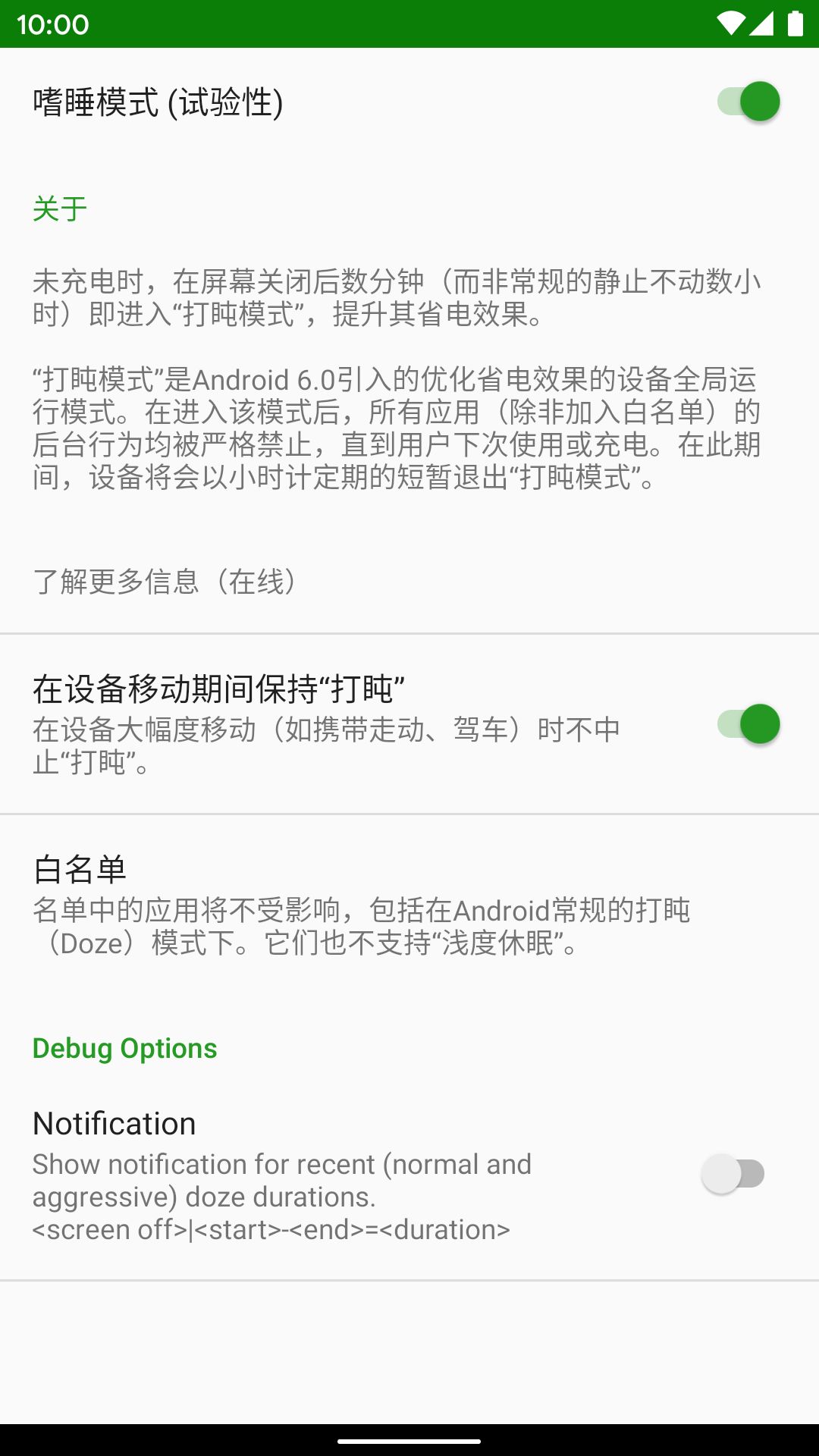 绿色守护推出的嗜睡模式则是将 Doze 的触发条件减少到了屏幕关闭后的几分钟,从而提升 Doze 的省电效果。