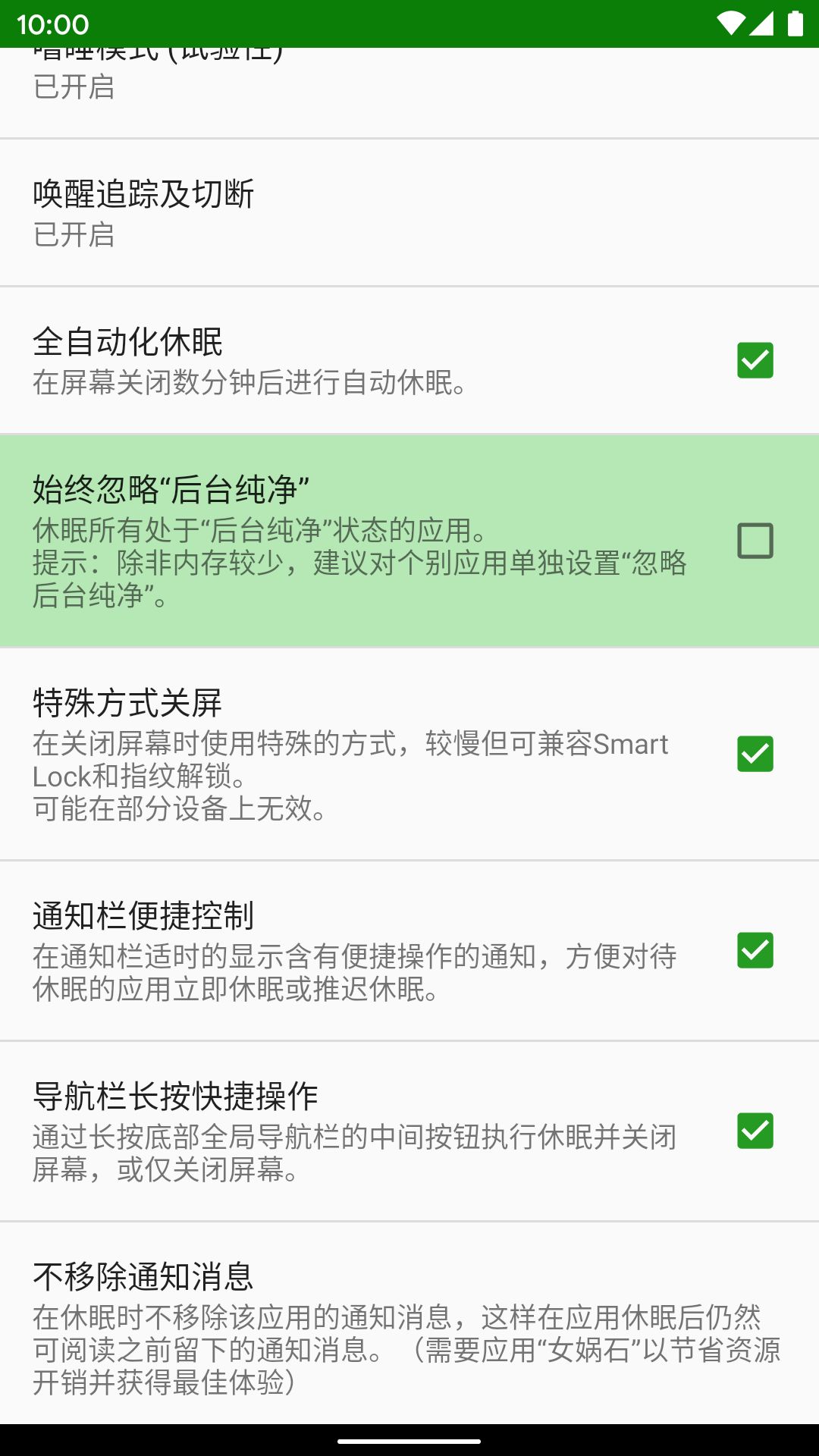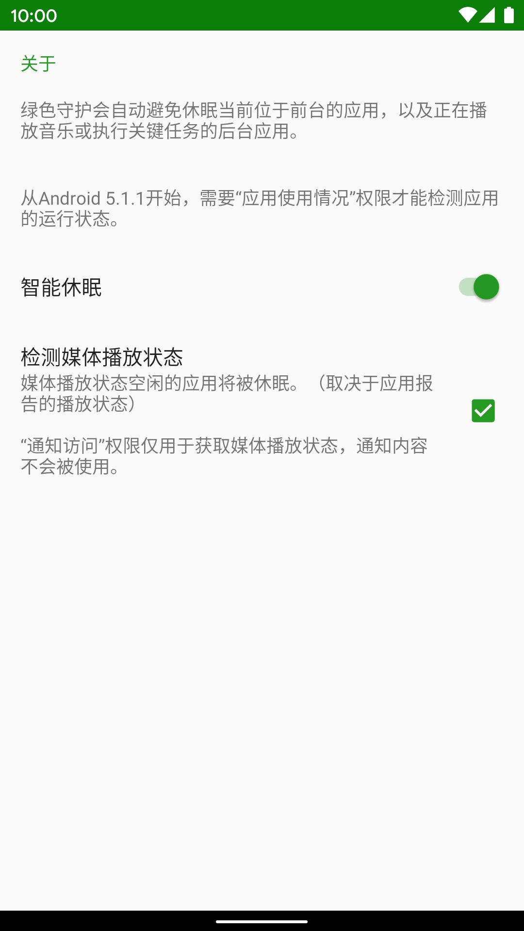 另一个附加选项是关于获取当前的媒体播放状态,从而避免休眠正在播放音乐的应用,这个功能需要额外授予绿色守护「通知访问」权限,无需 Root 权限,建议开启。