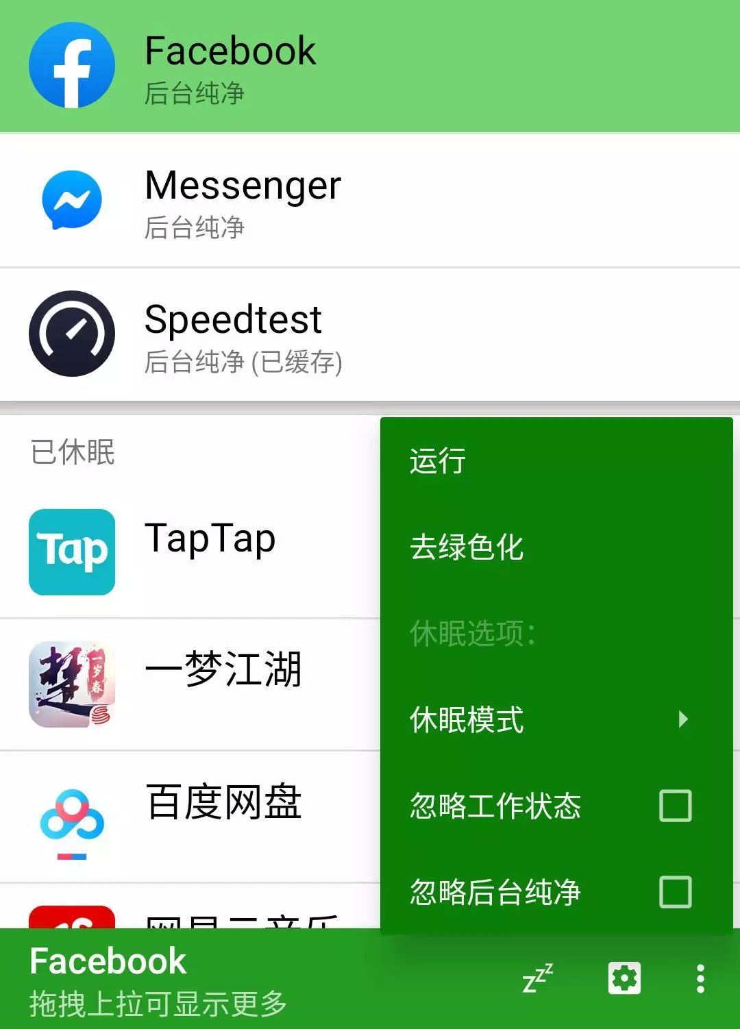 即便如此,如果你真的不希望某一应用的后台有一丁点的残留,仍然可以通过点击某个应用,并在右下角的菜单中选中「忽略后台纯净」和「忽略工作状态」来休眠这两类应用。