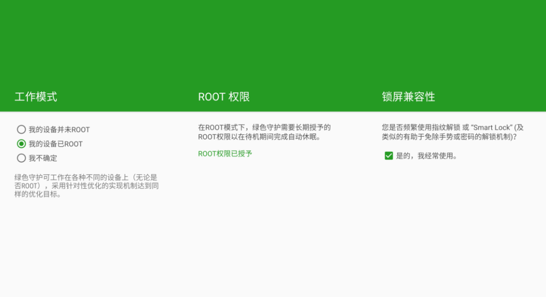 绿色守护的基础功能以及部分进阶功能都可以在非 Root 模式下启用,想要使用更多强力进阶功能,不妨考虑使用 adb 授权或是切换为 Root 模式。