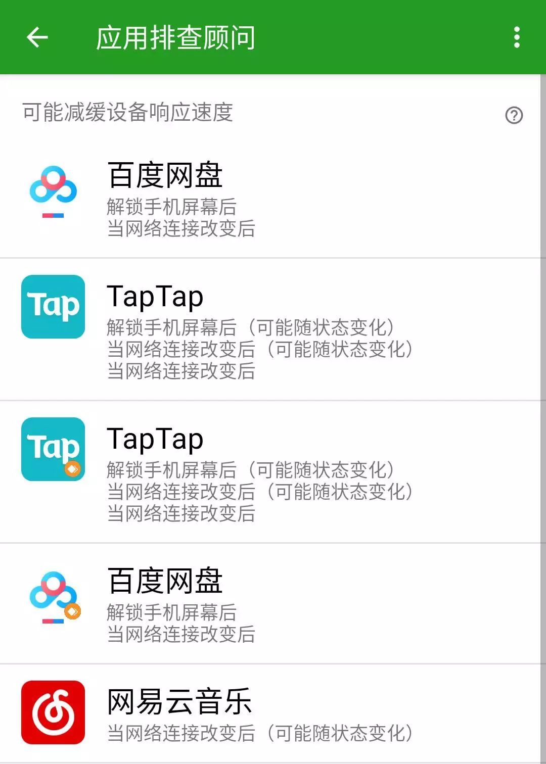 如果你在这个列表发现你明明当前没有直接使用甚至是许久没有开启的应用, 可以考虑将其加入绿化列表。