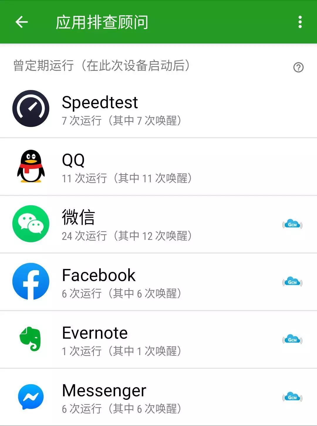 绿色守护还会统计应用的定期运行状况以及唤醒的次数,并将有这些行为的应用在「应用排查顾问」中显示出来,我们可以根据应用的类型(一般判定是否是微信等即时信息类应用)、唤醒次数等情况进行处理。