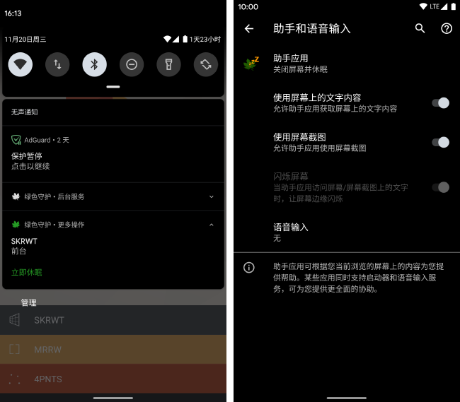 绿色守护的「导航栏长按快捷操作」便是将助手应用替换为绿色守护,在进行呼出激活操作的时候关闭设备屏幕并休眠应用。