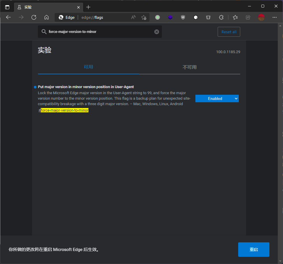 这里需要通过地址栏访问 edge://flags,检索到 Put major version in minor version position in User-Agent 后选择 enable 来进行 UA 锁定,锁定完成之后访问一些显示 UA 信息的网站,就会发现 UA 中 Edge 版本已经变成了 Edge 99。
