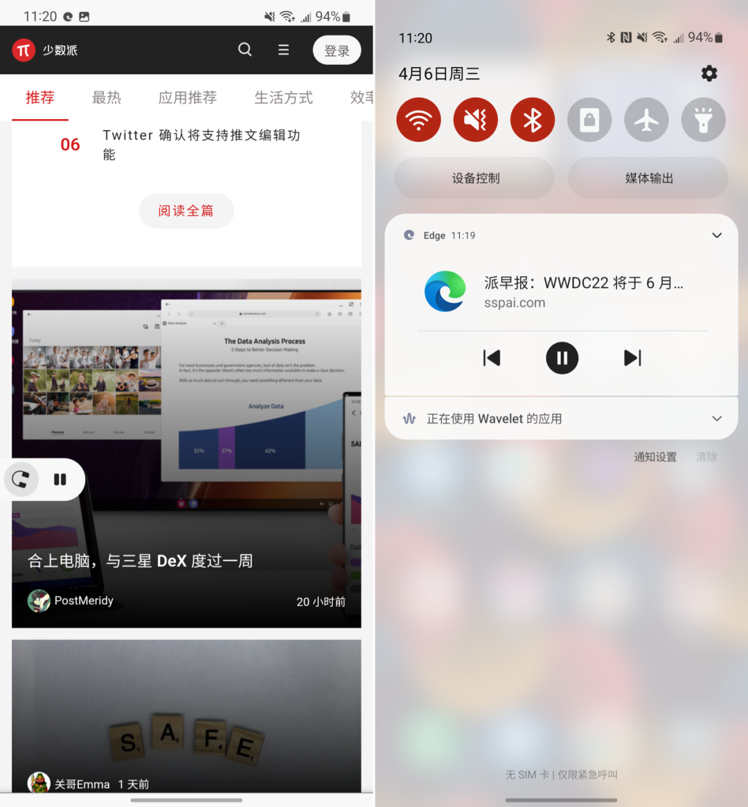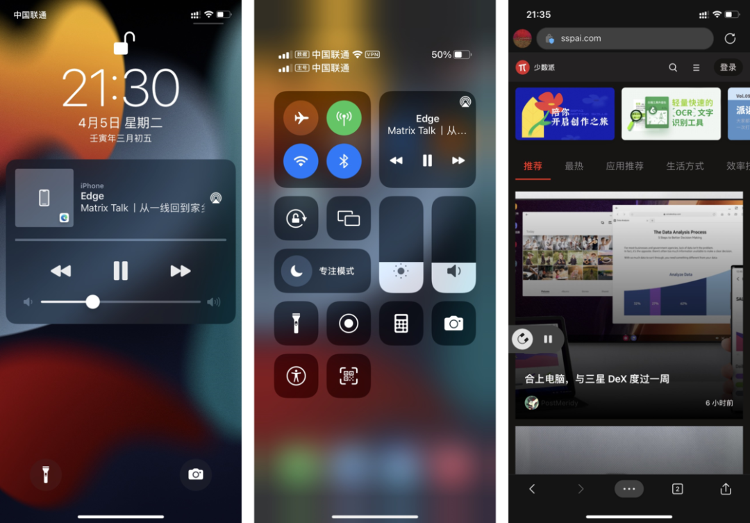 不同的是移动端还针对更为场景化的「后台收听」需求,在 iOS 版和 Android 中都支持了后台播放[1]。在 iOS 中,大声朗读功能可以调用系统的播放控制面板,Android 这边目前还未适配标准化的媒体通知样式,但不过无论哪个平台,我们都能像收听播客一样将浏览器放在后台听文章,并且随时通过通知和锁屏进行控制了。