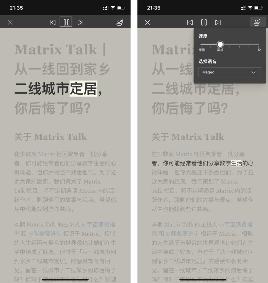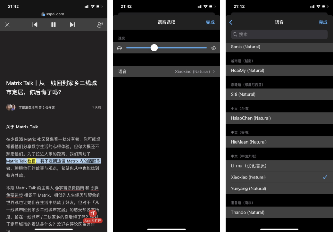 与桌面版类似,我们可以通过页面上方的大声朗读控制条来自定义语音效果,移动端的大声朗读也提供男声(Yunyang)和女声(Xiaoxiao)两种自然语音可选,并且支持语速调节。