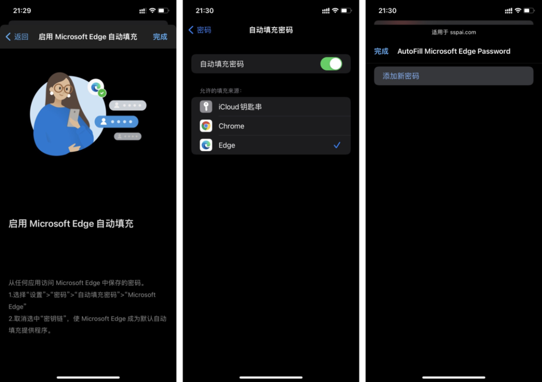 基础功能方面,Edge 100 稳定版在 Android 和 iOS 两大平台上现在都可以注册为系统的自动填充服务,我们可以在系统设置中选择将其作为默认的自动填充来源,这样就能在浏览器内以及第三方应用中选择并使用 Edge 浏览器中保存的登录信息。