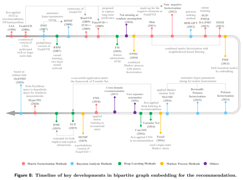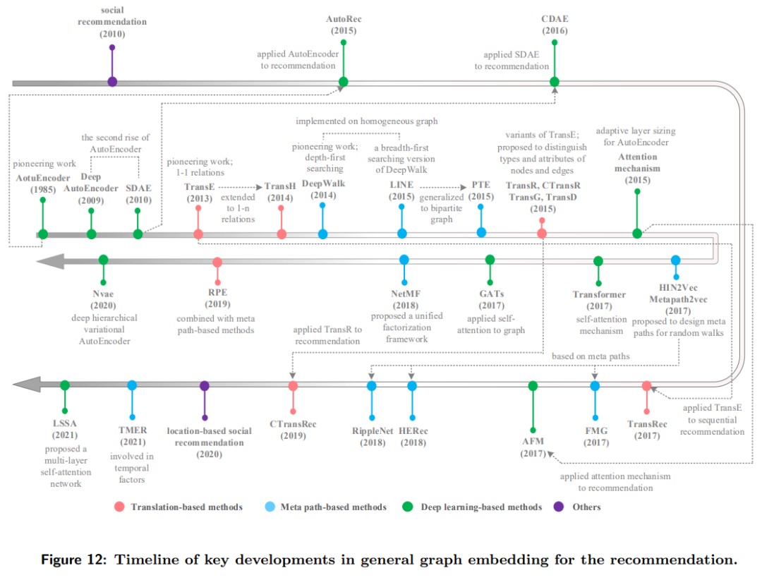 为了推动这一趋势,本文号召来自不同学科领域的研究人员开展交叉研究合作。对此,关于传统推荐和基于图嵌入技术的推荐的详尽的综述是实现如此沟通的桥梁。虽然前者已具备,但纵观近几年发表的综述后,发现后者仍缺失。本文旨在对其进行弥补,分别从二部图、广义图和知识图谱的视角系统地综述了图嵌入技术及相应的推荐模型,总结为下面三张图所示。