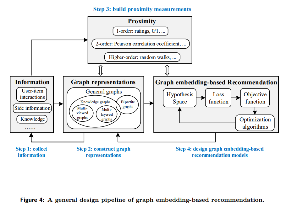 同时,为了更有效地对这些框架下的推荐模型进行全新的建模,推动领域的发展,本文还提出了一个用于基于图嵌入技术的推荐系统的建模方案。其结合了计算机科学家偏向的“从数据(任务)出发”的角度和物理学家偏向的“从通用性出发”的角度,如下图所示。该建模方案中也涵盖了推荐系统,包括传统推荐和基于图嵌入技术的推荐,的连贯运行流程:输入信息、构造图表示、设置相似性度量、选定推荐方法和构造推荐模型。本文认为,推荐模型的建模过程应是上述整套流程的体现。