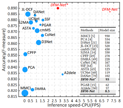 此外,我们还设计了轻量编码器-解码器框架,包括定制深度骨干(Tailored depth backbone,TDB)和两阶段解码器(Two-stage decoder)以进一步提升模型效率。最后,将DQFM嵌入到该框架中构建出名为DFM-Net的高效RGB-D SOD模型。大量实验结果表明,即使与非轻量模型对比,DFM-Net的精度也达到了最先进的水平,同时其在CPU上的推理耗时为140ms(约为现有最快模型速度的2.2倍),模型体积仅有8.5Mb(约为现有最轻量模型的14.9%)。