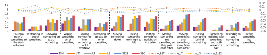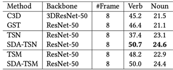 为了检验SDA对于视频动作分类的有效性,我们将SDA插入TSN以及TSM模型,表1-3分别展示了SDA在Something-Something V1&V2、Dinving48以及Epic-kitchen55上的性能表现。