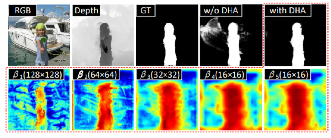 DQFM非常高效,其体积仅为0.05Mb。它包含深度图质量启发加权(Depth quality-inspired Weighting,DQW)和深度整体注意力(Depth holistic attention,DHA)。如果深度图质量不佳,就赋予其特征一个较低的加权系数,有效地避免噪声和误导性的深度图特征,以此来提升检测精度。DQW预测的加权项是一个标量,决定了“多少比例”的深度特征的参与融合, DHA预测的加权项是一个空间注意图,决定关注深度特征的“哪些区域”,通过与深度特征进行连续相乘实现特征控制。下方的可视化图3-4分别展示了DQW、DHA的表现。