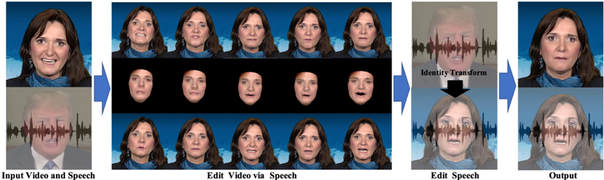 图1 英语女主播音视频编辑流程。输入为女主播的原始音视频内容和目标特朗普的语音,输出为转换后的语音和对应的唇形匹配的视频。这里我们使用三维面部形变模型作为中间过渡特征。