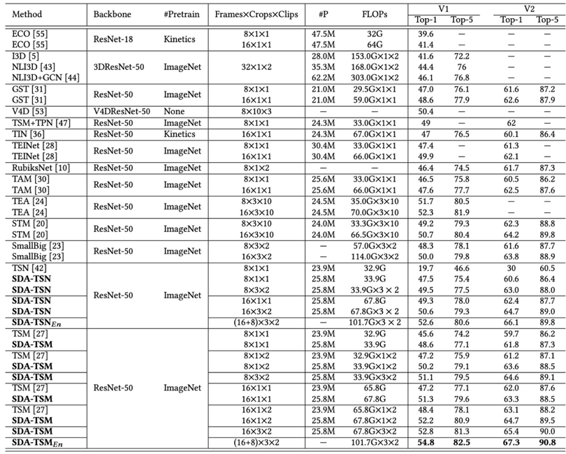 表 1 SDA与其他SOTA方法在Something-Something V1&V2上的性能比较