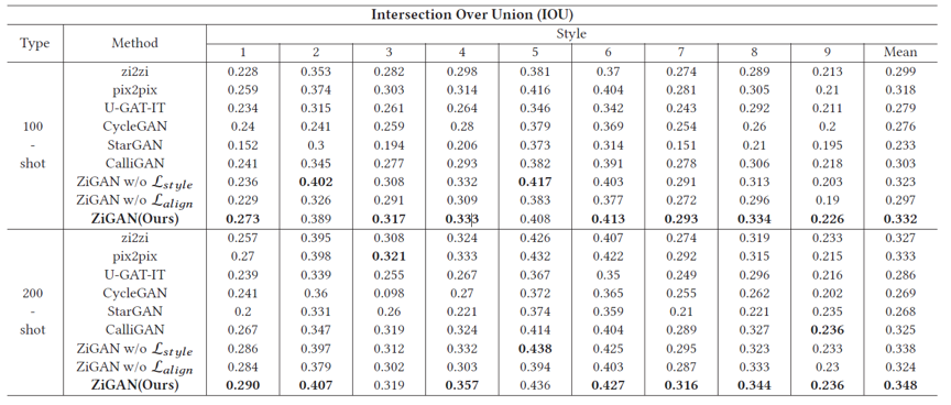 我们从风格和形态两个层面来定量评价ZiGAN的结果。如表1和表2所示,结果表明ZiGAN在少量数据的字体风格迁移领域,和其他的先进方法相比取得了更好的效果。