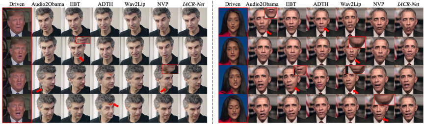 我们复现或者遵循官方开源代码重演了其他基于语音的面部合成算法,并且将这些算法和我们的算法进行对比,对比可视化结果如 图.3 所示。从 图.3 中可以发现我们的方法能够合成最为真实的帧级的面部图像。例如,在和当前最为流行的方法 Neural Voice Puppetry: Audio-driven Facial Reenactment x相比,我们的方法在面部表情差异较大时合成的面部更加真实,这是由于我们的方法不需要对于渲染后的面部进行贴合到背景之中,不会产生明显的面部边缘贴合纹理,这种痕迹通常是由于原始表情和编辑后的表情有较大差距导致的。额外的,对于其他的相关方法,我们的方法无论是在背景还是在面部纹理上都有着明显的优势。对于视频级的结果,我们将其添加在视频附件中。