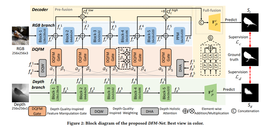 动机:深度图的不稳定质量是影响RGB-D SOD精度的关键因素,现有多数方法对该问题并没有针对性地进行处理,因为直接对深度图自身质量进行评估是比较困难的。如图1所示,我们观察到高质量的深度图往往能够精准地对齐相应的RGB图像,这一现象被称为“边缘对齐”。可将其作为深度图质量的良好指标,由此我们提出了深度图质量启发的特征控制(Depth Quality-Inspired Feature Manipulation,DQFM)过程。它可以根据深度图质量过滤深度特征,有效提升模型精度,并且具有轻量高效的特性。