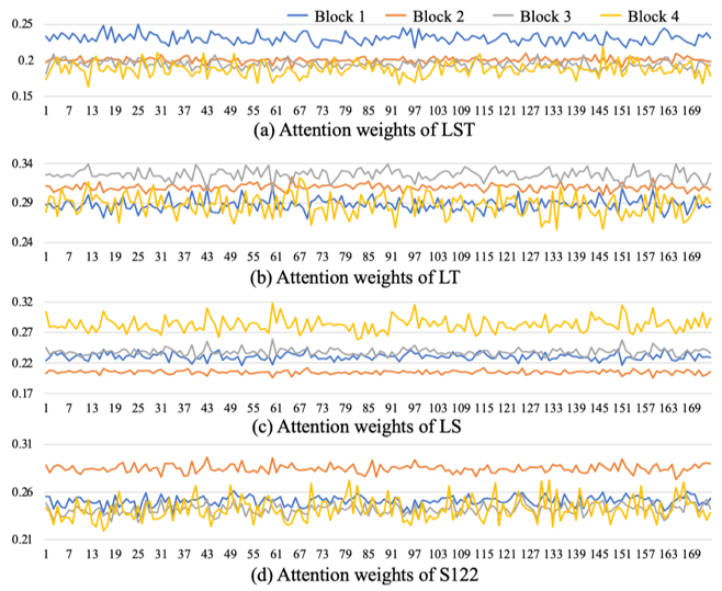 图4 随着网络深度变化,各时空依赖被赋予不同的权重