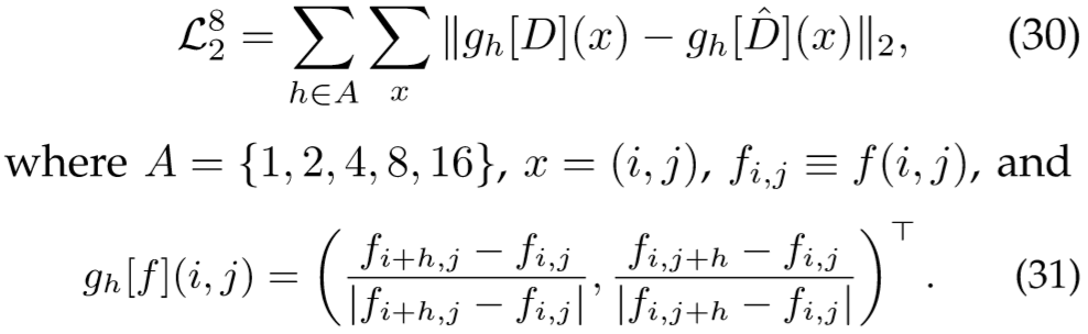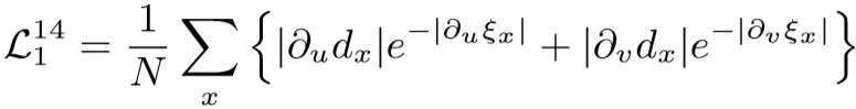 loss函数的功能在于描述估计视差(深度)和真实值的差异,并用它来调整网络权重。一般来说loss由两部分组成,如公式7。 为估计的深度图, 为真实深度图, 为训练集, 为网络权重。