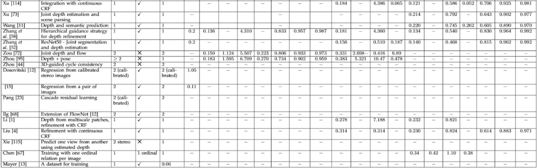 大多数效果比较好的方法都需要真实深度图。但是真实深度比较难获取,所以非监督的训练方式更吸引人。无监督训练的关键在于基于重投影误差构建loss函数,但这需要相机参数。根据TABLE 5可知,有真实深度图训练效果更好,比如 Yang et al. [25] 。