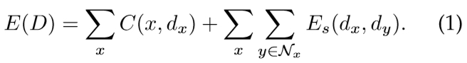 优化量 如公式1。 为像素, 为对应的深度。 为匹配的cost, 为正则项。四个部分中前两个部分构建 ,后两个部分构建 并估计深度(视差)。
