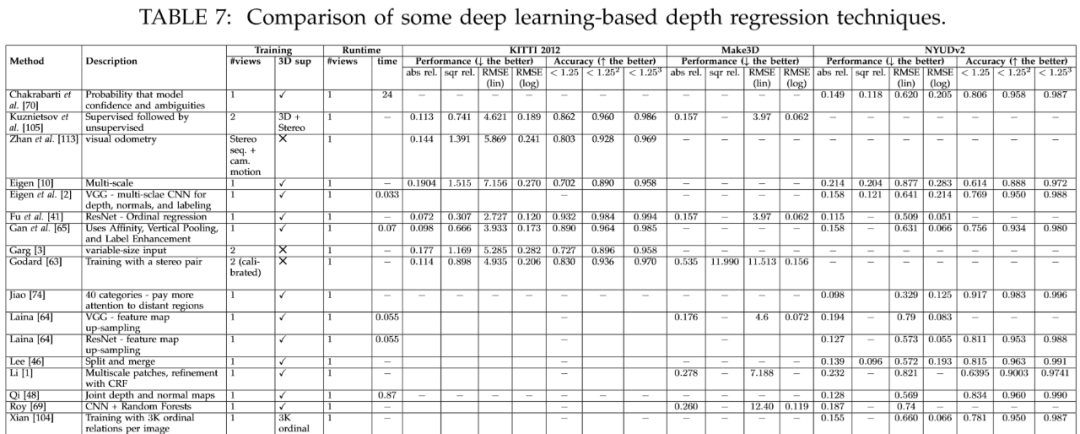 TABLE 7总结了深度学习方法回归深度的结果。有如下四个结论。