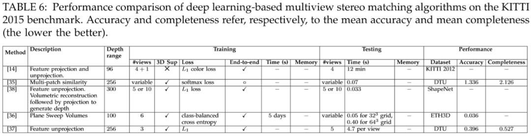 TABLE 6比较了五种深度学习多视重建算法。TABLE 6中大多使用了有监督学习,且大多没有达到子像素精度,需要提前给定深度的计算范围且在不调整网络结构重新训练的情况下,无法更改范围。另外,这些方法在重建细微的特征(比如植被)时会计算失败。