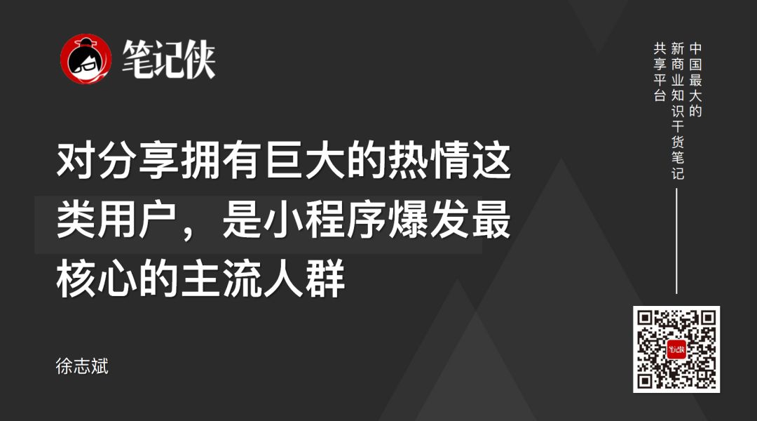 但是我们这些主流人群一天能分享1-2条已经很了不起了,甚至这1-2条还是老板亲自逼着、好朋友摁着不得已帮忙分享的。但就这部分普通用户却对分享拥有巨大的热情,是小程序爆发最核心的主流人群。