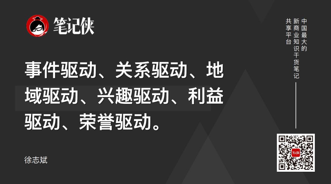 事件驱动、关系驱动、地域驱动、兴趣驱动、利益驱动、荣誉驱动。