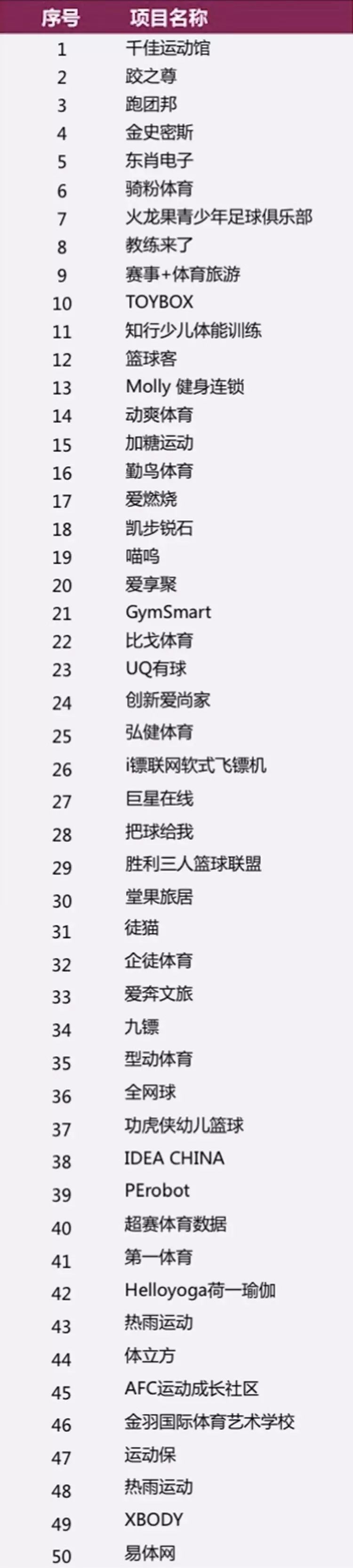 历时月余的报名后按照创业项目为户外、体育等相关产业及其扩展领域,筛选出50家公司创始人,进入体育行业营,入营名单(以下排名不分先后):
