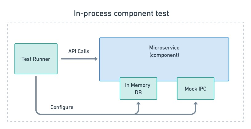 组件测试在和微服务相同的进程内运行。测试在适配器中注入一个模拟服务,以模拟与其他组件的交互。