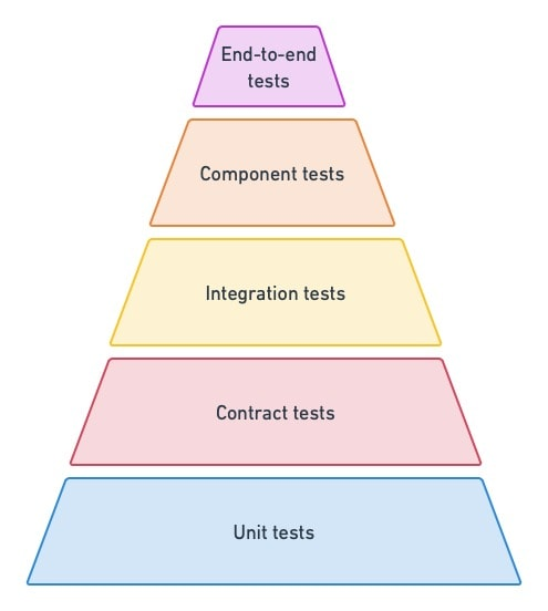 这是微服务测试金字塔的一个版本。其他版本可能顺序上会有所不同。有些版本可能将契约测试包含在了集成层。事实上,金字塔更多的是一份指南,而非一成不变的东西。