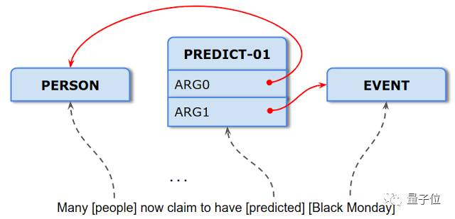 比如说句中的“predict”,就表示为PREDICT-01框架。PREDICT-01和施行predict这个动作的主体有交互(插槽),通过ARG0插槽表示,ARG0与表示“people”的PERSON框架相连接;PREDICT-01还和被预测的客体有交互,表示为ARG1插槽,和表示“Black Monday”的EVENT框架连接。